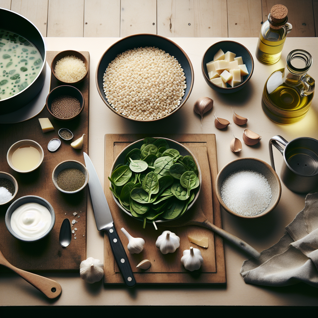 A light, creamy stovetop barley dish with tender spinach, garlic, parmesan and a spoon of low-fat Greek yogurt for a balanced, slow-release dinner for two.