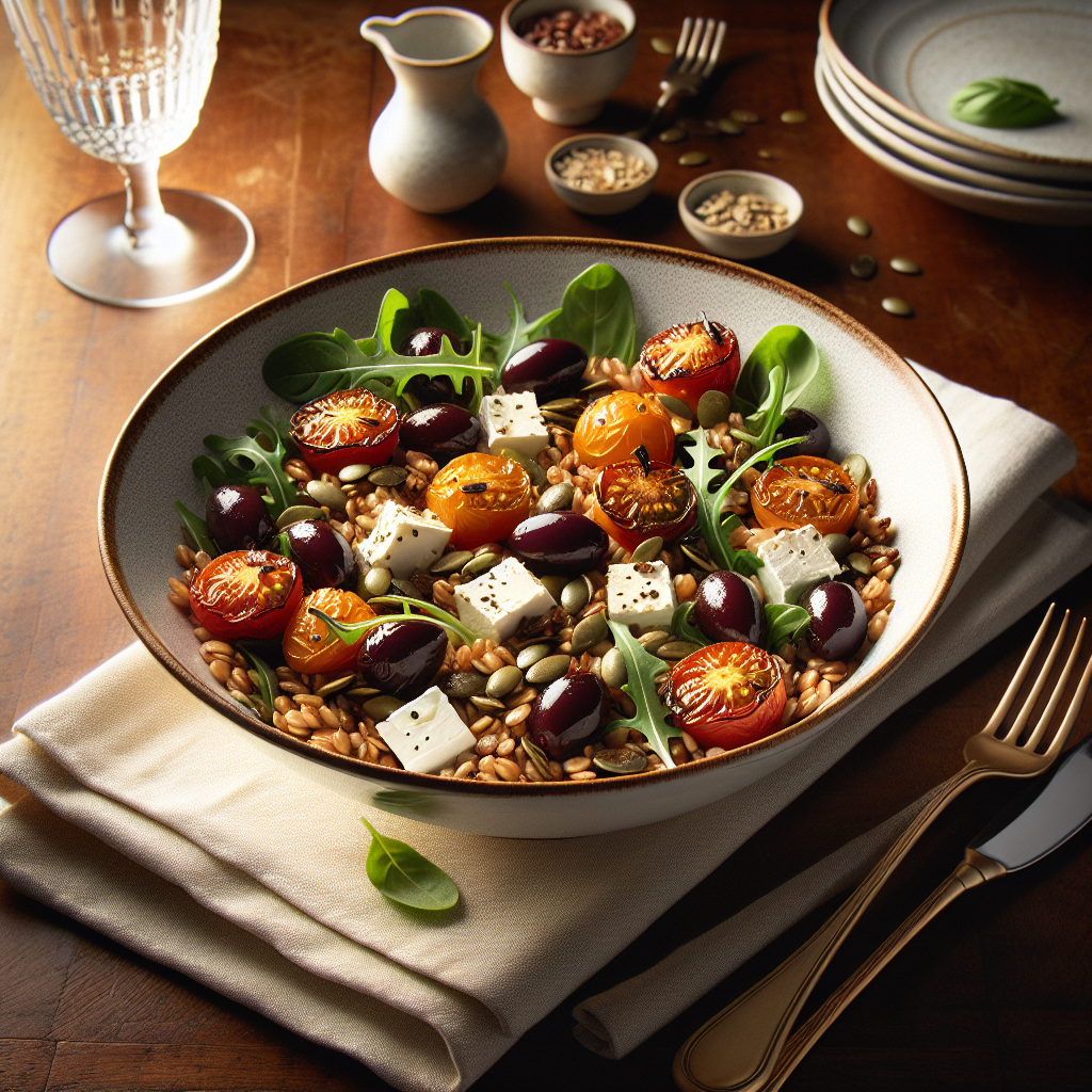Hearty, light, and balanced bowl with chewy Farro, sweet roasted Cherry Tomatoes, Peppery Arugula, and creamy baked Light Feta for a steady, slower blood sugar rise.