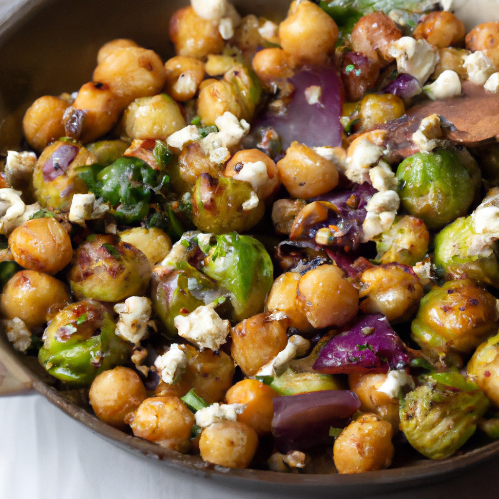 Simple roasted Brussels sprouts with red onion, chickpeas and light feta, finished in one skillet for a balanced, slow-carb dinner.