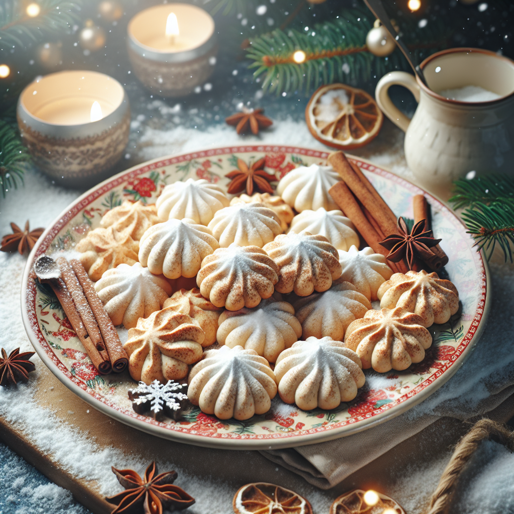 oneliner: delicate star-shaped cinnamon almond cookies with glossy white meringue glaze on a rustic wooden table with holiday spices