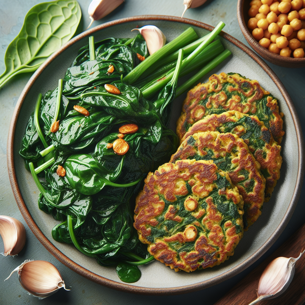 A simple, protein-rich, and gluten-free meal featuring savory chickpea pancakes served with garlicky wilted greens.
