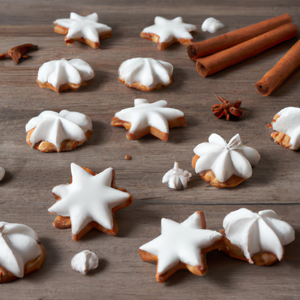 oneliner: delicate star-shaped cinnamon almond cookies with glossy white meringue glaze on a rustic wooden table with holiday spices