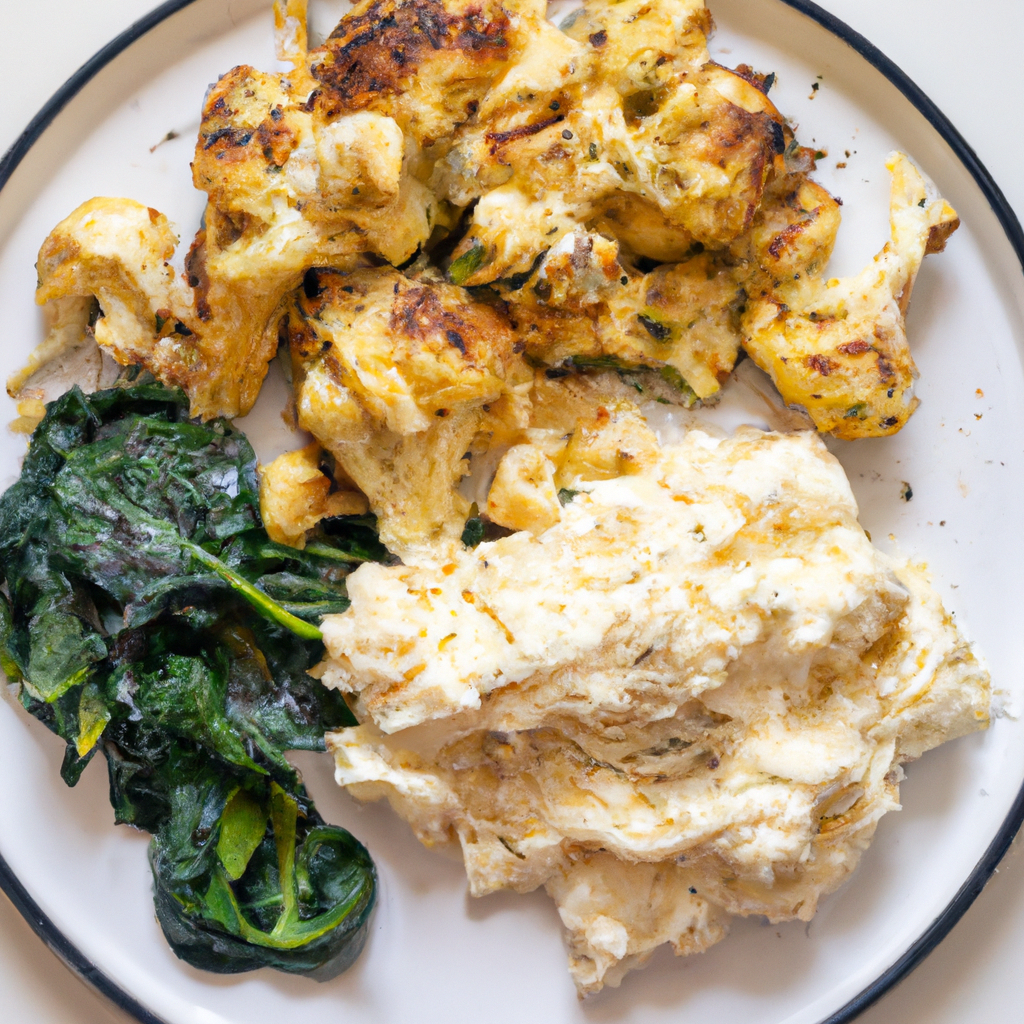 Lightly spiced scrambled eggs enriched with low-fat cottage cheese for creaminess, paired with roasted cauliflower and wilted spinach for a nutrient-packed, low-carb breakfast.