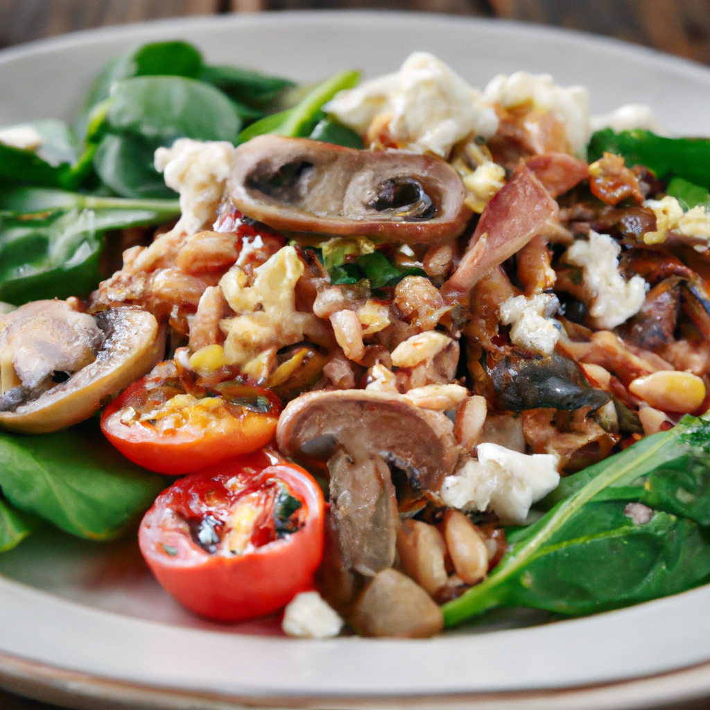 - Assemble Salad: In a large bowl combine warm farro, roasted mushrooms, halved olives, cherry tomatoes, sliced red onion, baby spinach and parsley. Sprinkle with crumbled feta if using. Drizzle dressing over the salad and toss gently.