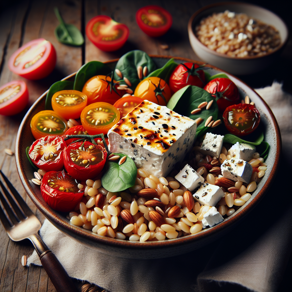 Hearty, light, and balanced bowl with chewy farro, burst tomatoes, and creamy baked light feta for a steady, slow blood sugar rise.