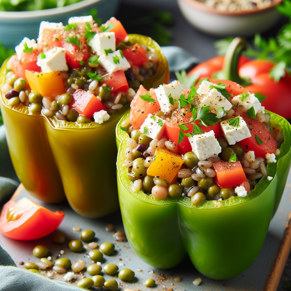 Sweet bell peppers stuffed with a mild Mediterranean mix of green lentils, wild rice, tomatoes, onion and garlic, finished with crumbled Feta and parsley for a light, slow-blood-sugar dinner.