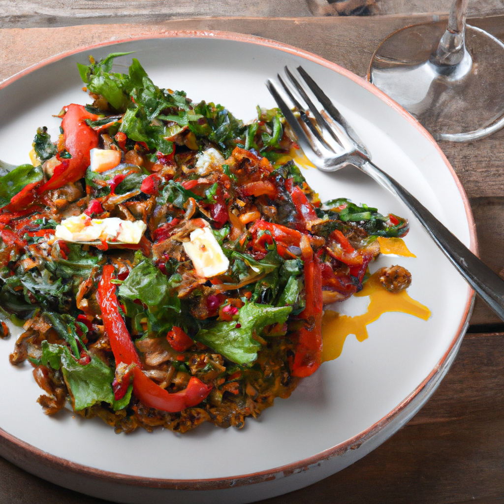 A warm, light salad of green lentils, charred roasted peppers and wilted spinach, finished with low‑fat feta and a simple red‑wine vinaigrette — filling but gentle on blood sugar.