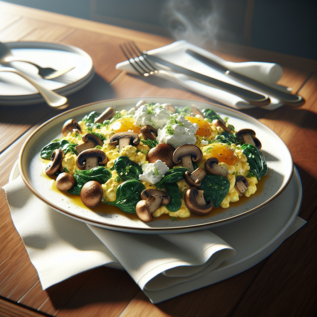 A simple, savory skillet of mixed mushrooms and fluffy eggs with wilted spinach, finished with crumbled feta — perfect for a light breakfast or brunch that keeps blood sugar steady.