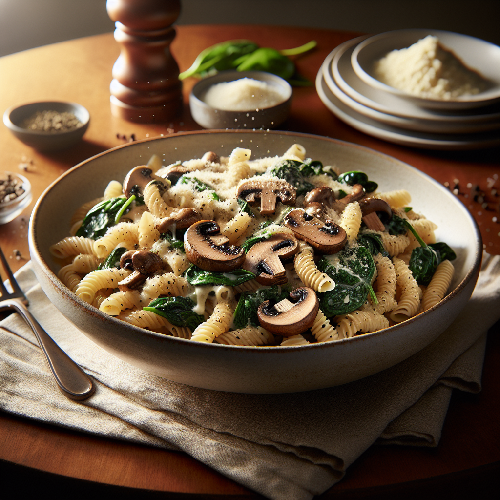 Creamy whole grain pasta tossed with sautéed shiitake and cremini mushrooms, wilted baby spinach, and a light sauce of cottage cheese, cream cheese and Pecorino — simple, satisfying and blood sugar-friendly.