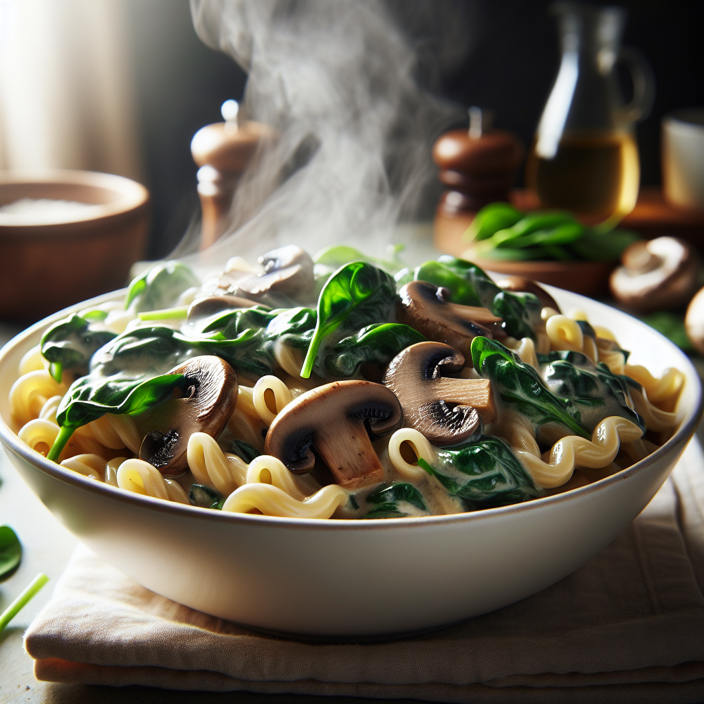 Creamy mushroom pasta with spinach for a nutritious, blood sugar-friendly meal.