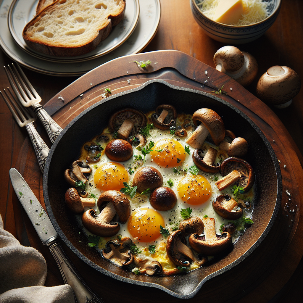 A simple, savory skillet of sliced shiitake mushrooms sautéed with garlic and thyme, topped with softly scrambled eggs and a sprinkle of Parmesan, served with a slice of whole grain bread.