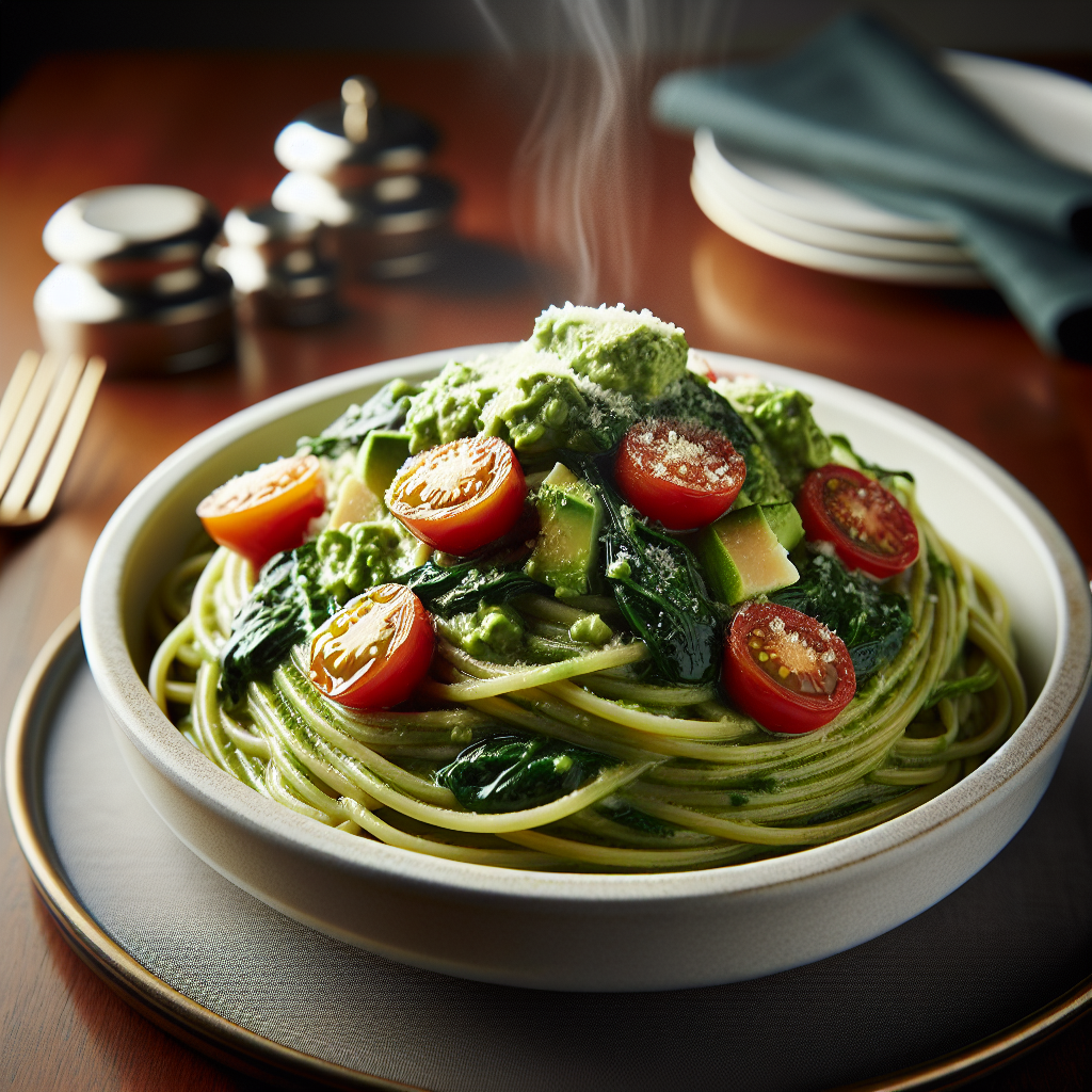 A simple, low-fat vegetarian pasta for two with a creamy avocado-spinach sauce — whole wheat spaghetti tossed with blended avocado, fresh spinach, garlic, Greek yogurt and Parmesan, topped with cherry tomatoes.