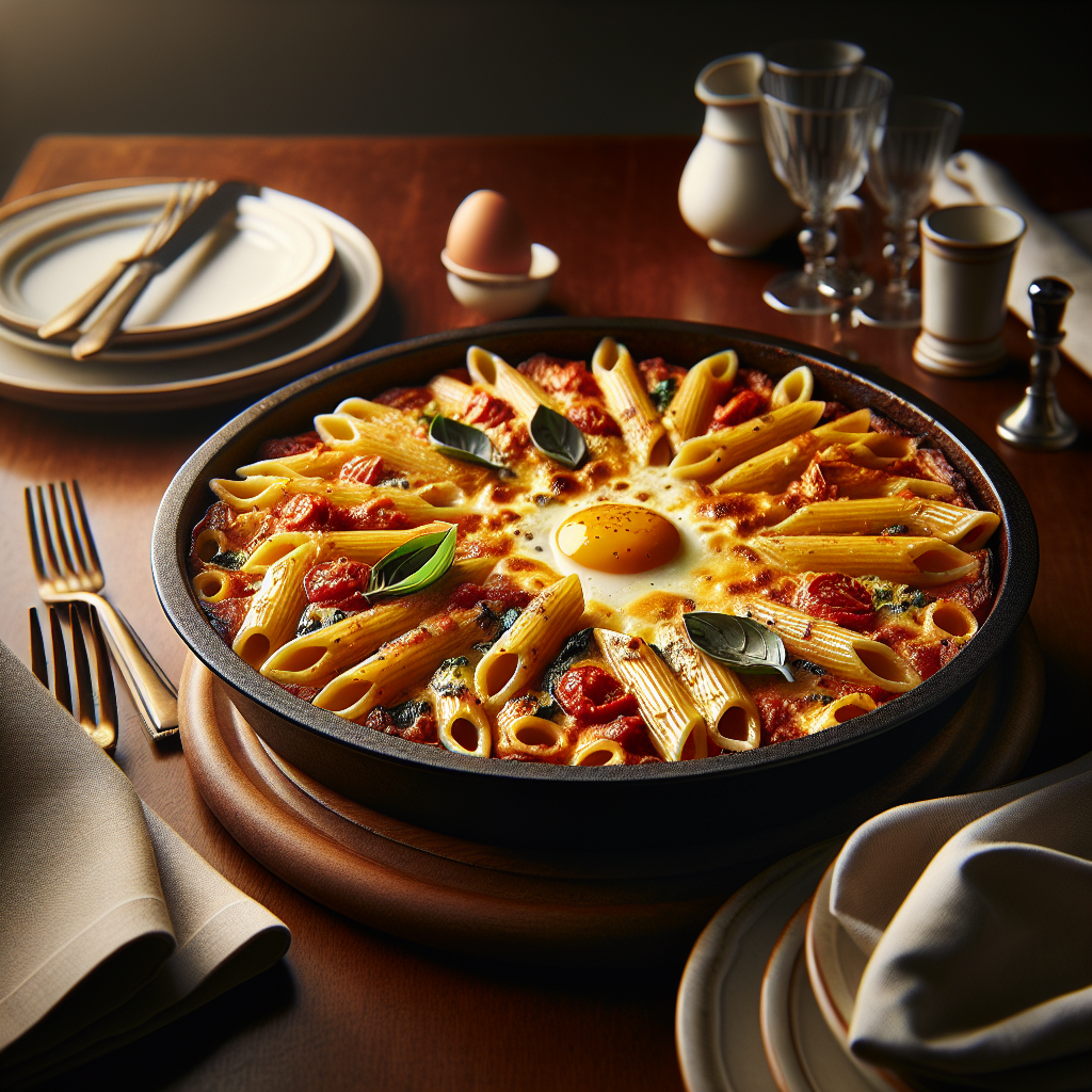Whole wheat penne tossed in a light pesto-tomato sauce with softened onions and garlic, enriched with beaten eggs stirred through, then topped with a golden Gruyère crust and baked until set and bubbling.